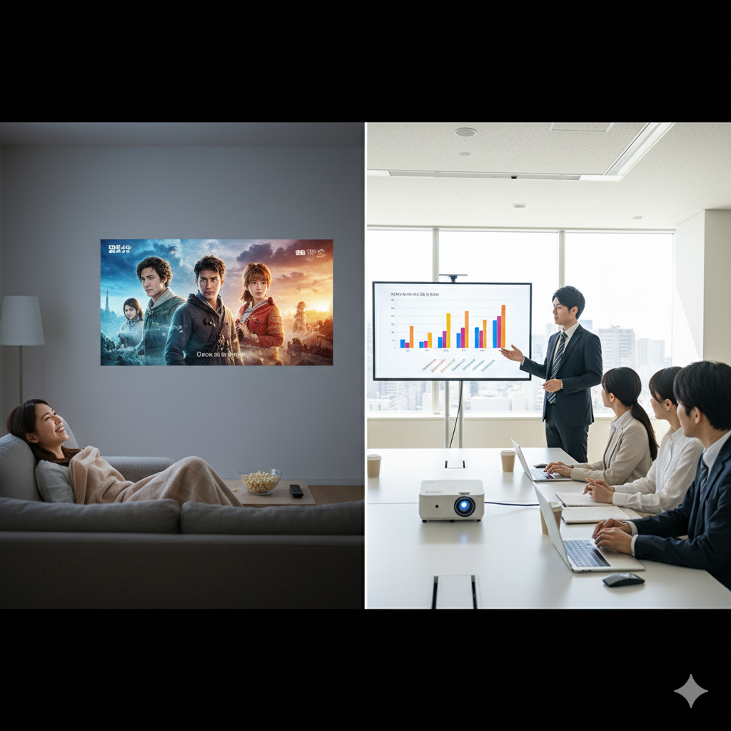 プロジェクターは、大きく分けるとホーム用とビジネス用の二種類があります。これは目的が異なるため、それぞれに特化した機能や性能が備えられているからです。多くのホーム用プロジェクターは、映画やドラマなどの映像コンテンツを美しく、迫力ある大画面で楽しむことに特化しています。そのため、高解像度や高いコントラスト比が重要視されます。映画館のような映像体験を自宅で再現するために、暗い部屋での使用を想定したモデルが多いです。